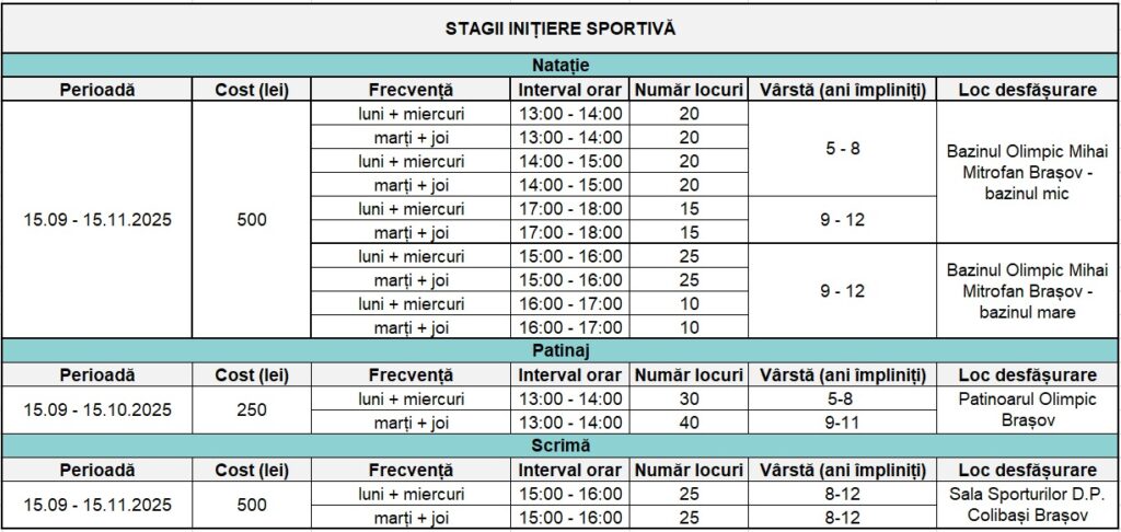 Stagiul de inițiere în natație se va desfășura la Bazinul Olimpic Brașov în perioada 15 septembrie – 15 noiembrie 2025.