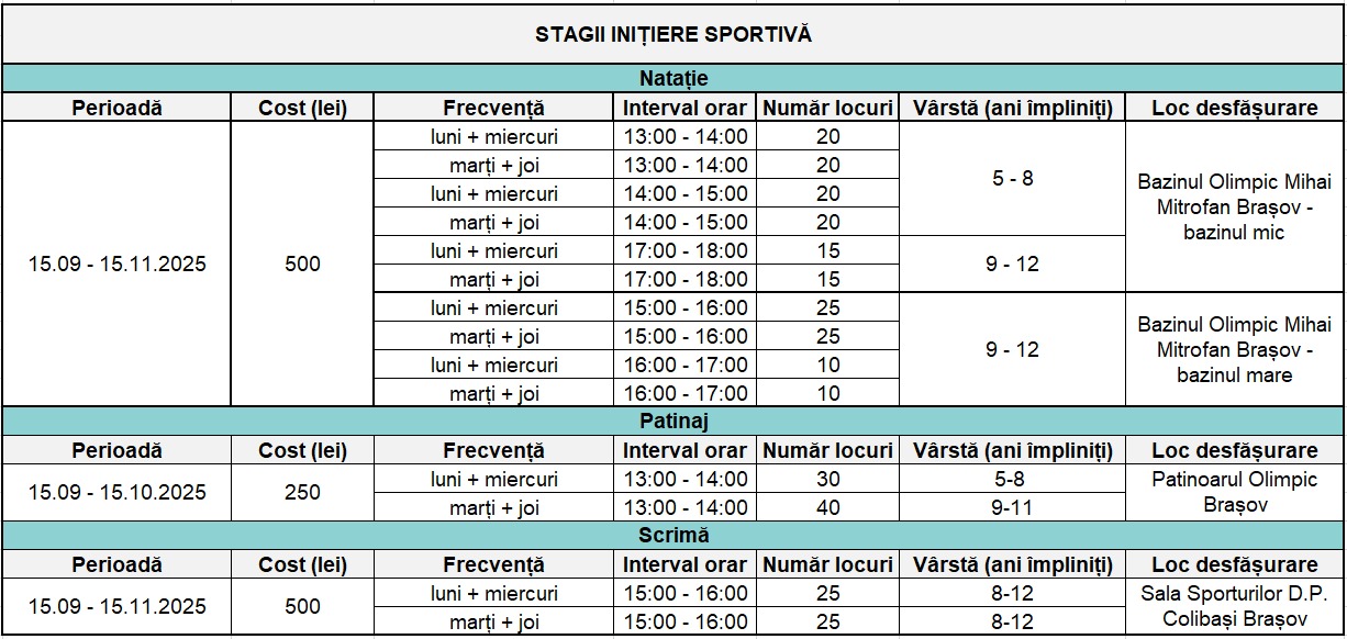 Stagiul de inițiere în natație se va desfășura la Bazinul Olimpic Brașov în perioada 15 septembrie – 15 noiembrie 2025.